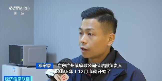 广东广州某家政公司保洁部负责人 邓家豪:高峰期我们从(2025年)12月底开始,一直会持续到2月份,已经开始筹备增加人手了,同时开通夜间的服务,晚上加班加点做。